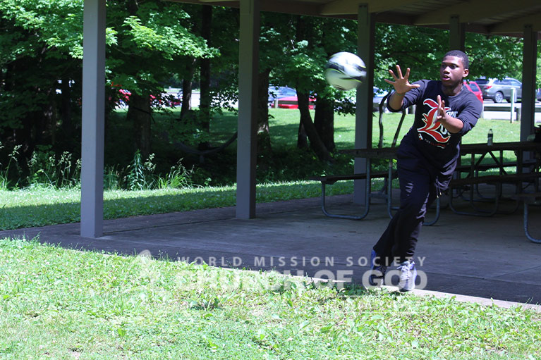 Two World Mission Society Church of God members playing Frisbee during Taylorsville Lake Family Cookout